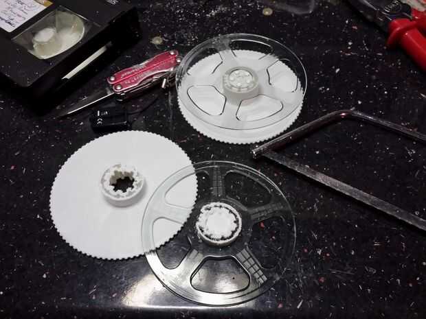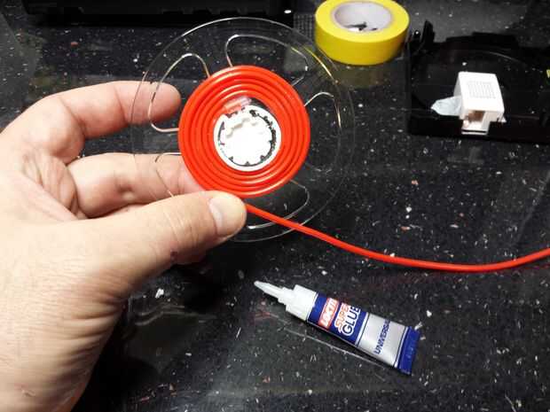 Necesitaba algo más aunque, y la idea vino a mí para crear una "cinta" en EL alambre, por lo que brillan o flash muy bien en el caso. Había disfrutado de hacerlo antes con un cassette de audio y no pasó mucho tiempo - la parte más difícil fue desenrollar los interminables metros de cinta VHS! Corté a través de los ejes de la cinta por lo que habría suficiente espacio en el circuito del cubo USB instalado, dejando un pequeño borde para enrollar EL alambre alrededor, supergluing con cada paso que lo mantenga en su lugar. Usé alambre Orangy rojo para seguir con el tema general "frambuesa".