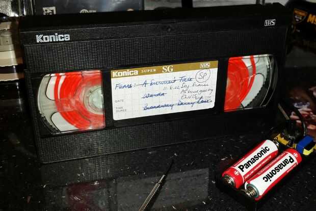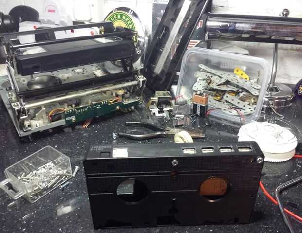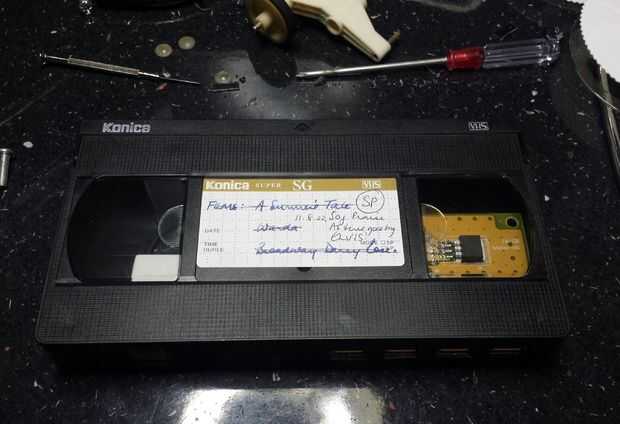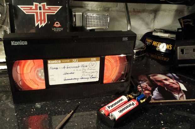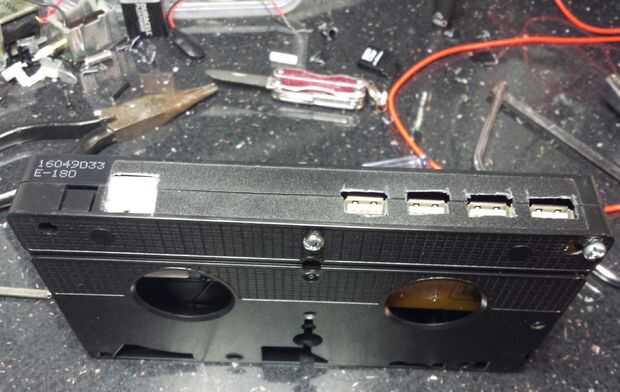 Recogió un viejo eje del USB de una caja de búsqueda en el maletero del coche para £1 y pronto encontró un ladrillo de la energía para en los cajones "Te guardo por si acaso" en mi taller. Aparte quebró fácilmente y es un trabajo fácil de pernos en una cinta VHS desmantelada, con los cables funcionando fuera de la parte inferior de la cinta por lo que se esconde. A continuación corte los orificios para las tomas USB, que era bastante incómodo trabajo - afortunadamente viejas cintas VHS son fáciles de conseguir, como que pierde un poco en este proceso.