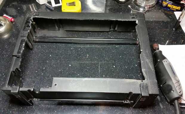 Cortar el agujero en la cubierta trasera con una sierra de calar, luego arreglado para arriba los bordes ásperos con una herramienta giratoria y papel de lija. También debían picar un poco de plástico desde el interior de la caja para hacer el sit panel rasante. Por suerte completa el conjunto de pantalla dotada de unos 2mm de sobra a ambos lados, lo que podría utilizar los originales soportes de pantalla plana para fijarla.