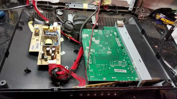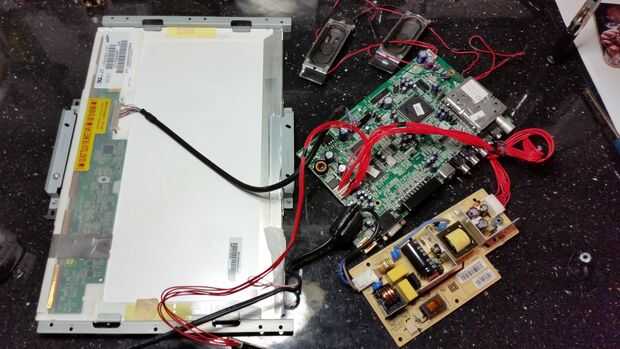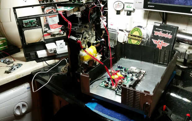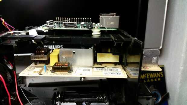A continuación, tomó una sábana vieja de plexiglás y había hecho un soporte para el tablero de control de TV, que en la parte trasera del panel LCD. El tablero de energía era demasiado espesa para montar junto a él, así que tuve que ubicar debajo de la Pi en la parte de "negocio" principal del VCR unos milímetros. No hago esto ligeramente significaba tener que extender los cables de luz de fondo de la TV y construir una caja alrededor del circuito para proteger que nadie se pegue a los dedos en el caso - todavía en este punto final a la vista y sabía exactamente que diferencias podrían ser utilizados. Después asombrado trabajando cuando me había desmantelado todo el conjunto listo para pintura.