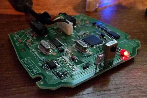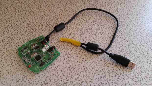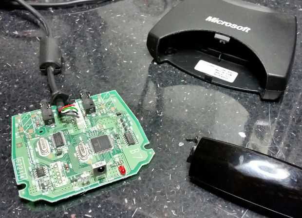 Usé un receptor USB Microsoft Media Centre y remoto y configurar el software de Raspbmc y trabajó tan bien que decidí construirlo el diseño final. Tomé el receptor primero aparte, revelando un pequeño circuito con ranuras prácticos que usé para empernar el caso debajo del panel del TV.
