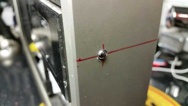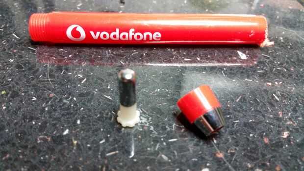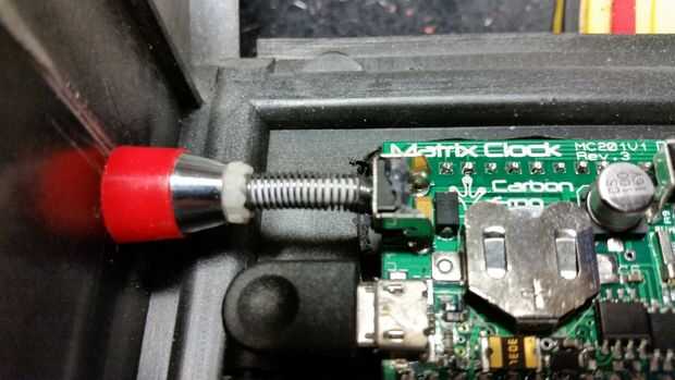 Puede recorrer efectos de transición del reloj pulsando un interruptor del empuje de su lado, y querer mantener esta característica en la construcción que necesitaba para hacer un botón para conectarse a través del caso de VCR y conectar con él. Hice la cosa entera de una pluma promocional, utilizando clicker de la pluma como el botón y conectarlo por dentro con el relleno, el resorte y el cuerpo de pluma de picado hacia abajo, después de haber perforado un agujero en el caso del clicker empujar a través de.
