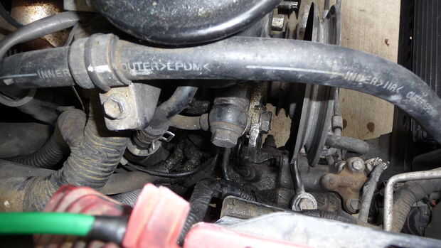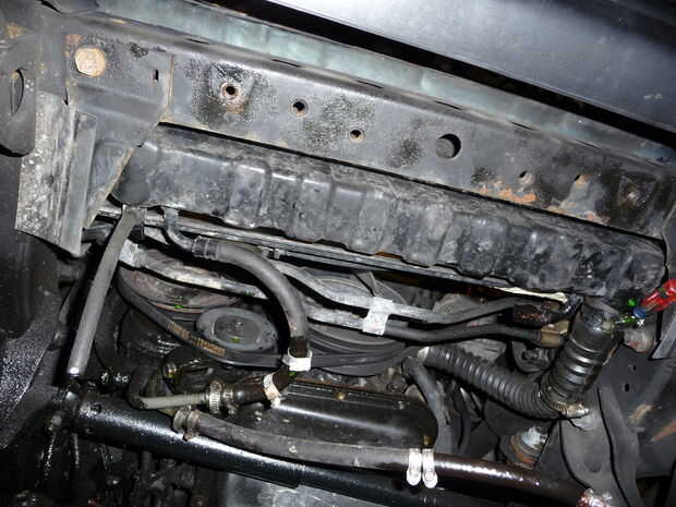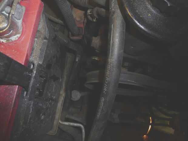 A continuación afloje el tensor de la PSP (pozo profundo de 14mm) consulte el cuadro para la extensión loco que tenía que hacer y de la serpiente allí (juego de manos es agradable para este paso) te recomiendo no sacar esto, causa sería una putada volver a poner. Esto se encuentra a la derecha de la batería y un poco detrás del depósito de PSP. Hay un bolt(14mm) basculante que también hay que aflojar para bajar la correa de la PSP.