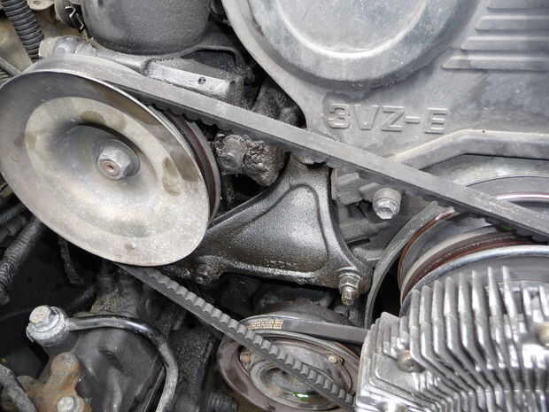Ahora golpea a esa polea con su martillo para aflojar la correa. Sacar el nut(12mm?) extractor polea de AC Quitar la polea y hardware, tengo una foto del orden correcto. RECUERDE QUE EL SOPORTE ES EN LA SECUENCIA!