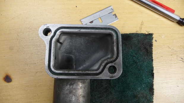 Ahora saca su navaja y eliminar gran parte de la Junta como sea posible. Luego tomar hacia fuera una hoja de afeitar nueva y hacerlo de nuevo. Luego tomar la uña de dedo y revise cualquier crud, quitar según sea necesario. Finalmente saque la almohadilla del bremmo y fregar las superficies hasta que la chispa.