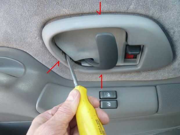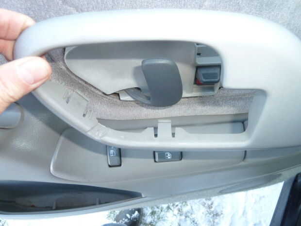 -El bisel alrededor de la manija se mantiene con 3 clips. Uso el destornillador plano en los lugares indicados para suelte los clips y el bisel hacia