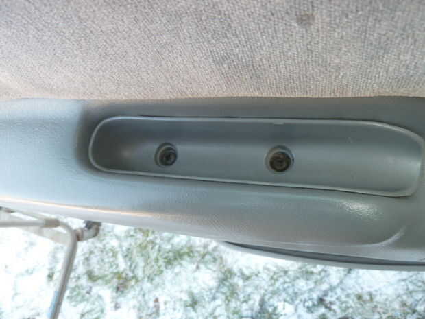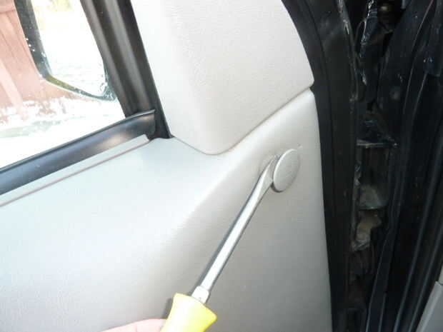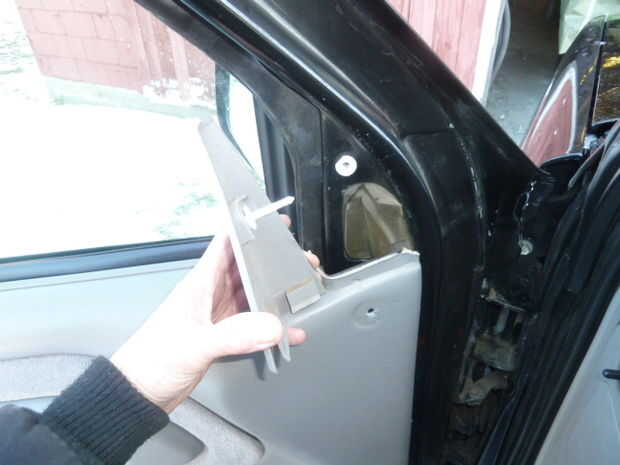 -La pieza de adorno triangular es sostenida en lugar por un sujetador único "árbol de Navidad". Los sujetadores del mismo se utilizan para sostener todo el panel a la concha de la puerta. Toma presión firme a lo suelto. Utilice el destornillador de punta plana insertado desde la parte delantera.