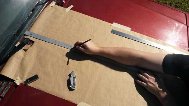Establecen algunos grueso papel marrón para hacer un patrón de la sangría en un montón de campanas de Jeep.   Use un lápiz para trazar el contorno de la pieza de campana que está queriendo hacer.