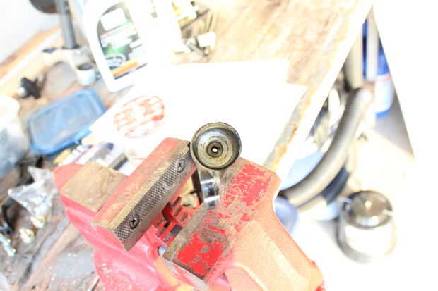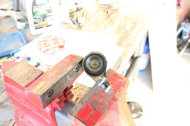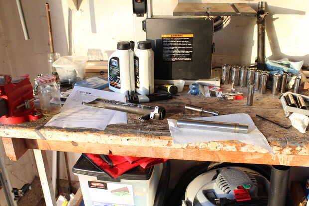 Tomar un cubo de 17 mm en el interior de la parte inferior de la botella para quitar el tornillo de"pie". No tengo una toma profunda así mina requiere una extensión en este paso. Con los tubos de la barra de ahora puede acceder a los sellos y llevarlos a cabo.