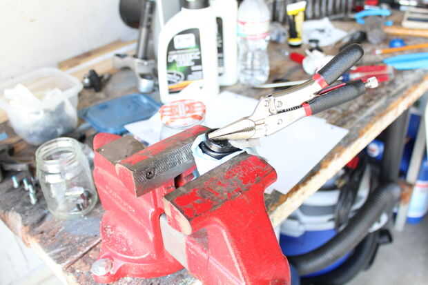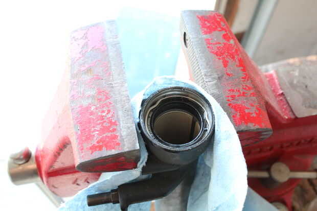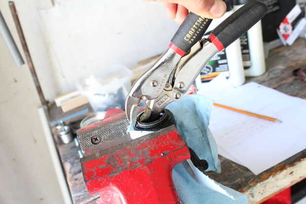 El sello superior se llama "guardapolvo" y tiene que eliminarse con un destornillador haciendo palanca entre el sello y el deslizador de aluminio. Parecía sería muy perjudicial para el deslizador de aluminio para no hacerlo. En cambio, empecé a tirar en el "guardapolvo" con pinzas de tornillo de banco porque las mordazas de sujeción de tornillo son en forma de una manera pellizcar el sello. Finalmente conseguí sacar pero sería más fácil sacar hacia fuera de lado a la vez con un destornillador de cabeza plana como las instrucciones del 80 X-FLY de juntas de horquilla de Enduro en el link que posteé en la introducción. El guardapolvo está hacia fuera, se encuentra otro "anillo de seguridad". Deshizo el anillo de seguridad con un destornillador que reveló el "retén". Me las arreglé para tire ésos hacia fuera con un apretón de mordaza de nariz de aguja. No era la tarea más fácil por lo que definitivamente le daría método de juntas de la horquilla Enduro un tiro. Envolver la cabeza plana en el punto de palanca con cinta aislante para protección y saque el sello de aceite de debajo.