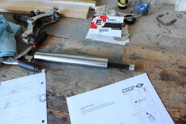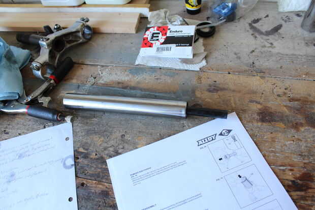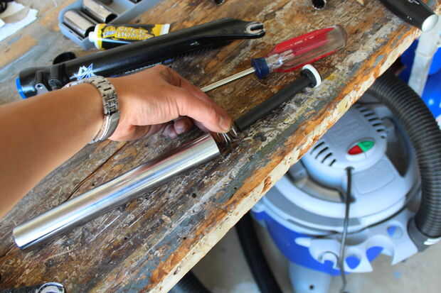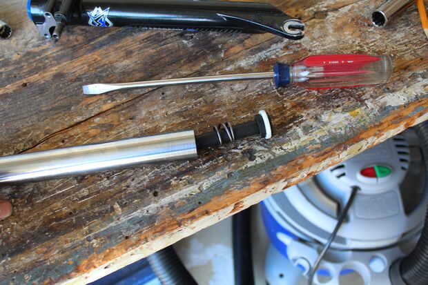Este paso es verificar el "anillo de sello". Creo que es necesario pero desmonté la varilla de bombea porque esto era en todas formas. La varilla de bombea es de plástico y tiene un cilindro hueco de aluminio llamado un "buffer de pie" prensa-cabido en el extremo para evitar que se salga. Sujeta la varilla de plástico y torcido de "buffer de pie", envolviéndolo primero para evitar dejar marcas de dientes. Una vez, impulsó la varilla de bombea con un destornillador de cabeza plana y la varilla de bombea, con el "anillo de sello" y "rebote primavera" en la apareció. Creo que el "resorte de rebote" es para evitar que la varilla de bombeo de tocando fondo. La varilla de bombea tiene un agujero por el lado que permite el aceite a una cierta velocidad para proporcionar amortiguación. Viendo que nada estaba mal con el sello, armé todo nuevamente.