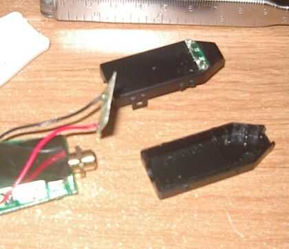 , tengo esta pequeña caja negra, pero se une al resto de las tripas. Resulta que dentro de la caja negra fueron dos pequeños LEDs. Proporcionó la luz para la exploración. El circuito impreso en la parte superior se realizó hacia abajo con cinta de doble cara y subió bastante fácil. Fue realmente débil, por lo que se rompió cuando vino aparte, pero eso no importa.