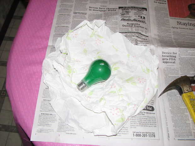 Tomar el extremo afilado de un martillo (no la parte de percusión, la parte que usted saca clavos con) y golpee suavemente la bombilla. Eventualmente en caso de rotura el vidrio o. Después de él no, al otro lado y recoger de la tapa de vidrio y metal. Debe tener pedazos bastante grandes.