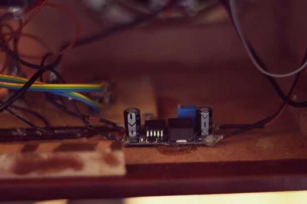 Paso conversor fue dado el poder del maestro interruptor On/Off. Usted necesita un multímetro para ajustar la salida de 5V girando el potenciómetro en el convertidor. Los pines de salida del convertidor fueron soldados a los terminales de alimentación del módulo de receptor de bluetooth.