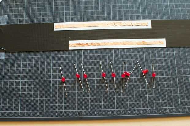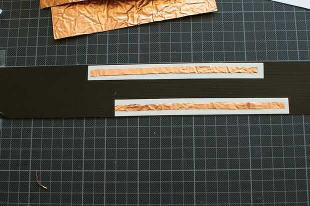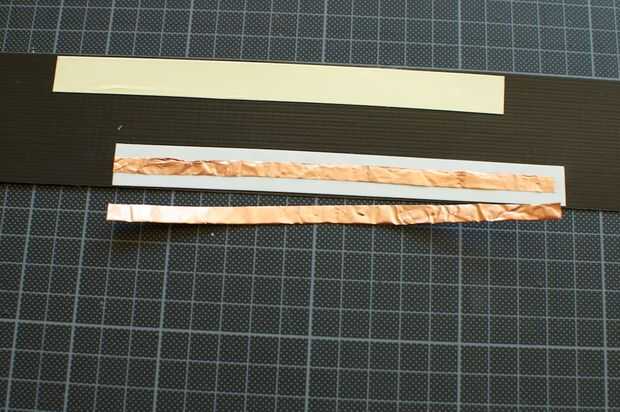 - Pegar las tiras de cobre estrecho (alu) en la cinta de doble cara, en el eje de longitud.