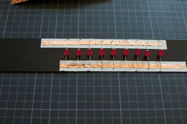 - Distribuir uniformemente el LED a lo largo que las tiras de cobre tienen en común. Importa la polaridad de los LED! En la imagen, todos los LED se enfrentan con el lado negativo (el lado que tiene un pequeño borde recto en la parte inferior). Introduzca consejos de LED en la cinta de doble faz para pegar.