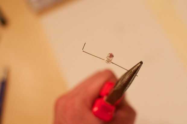 - Preparar el LED: para hacerlos más fácilmente de pie, doblar las puntas en una esquina recta, utilizando una pinza.