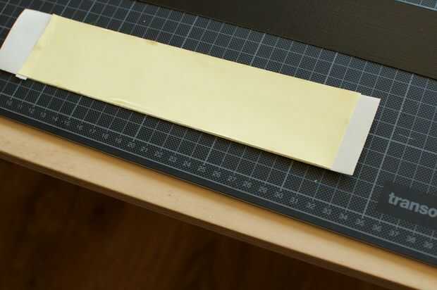 Corte de la cinta es muy, muy torpe, porque la cinta se pega a las tijeras y cortarlo. Quedé tan hartos que finalmente puse dos tiras de adhesivo de doble faz uno encima del otro, al igual que la banda ducttape. Así, es fácil de cortar un trozo de cinta de doble faz, teniendo ambos lados protegidos con el divertido papel resbaladizo (el papel que milagrosamente _won ' t stick_ en la cinta!)