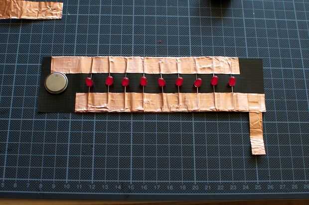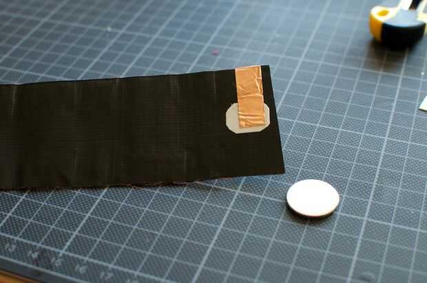 - Fijar la tira de cobre/aluminio en la parte posterior de la pulsera utilizando el pedazo de cinta.