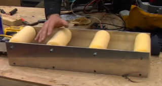 También utilicé cuatro rodillos de pintura 7" para las"ruedas"y algunos 1/8" aluminio de espesor en los laterales atornilladas a un trozo de madera para sostenerlos juntos. Conecte uno de los motores de 20 o 40 rpm a uno de los bordes exteriores. El sistema de correa transportadora todo debe ser de 22" de largo.