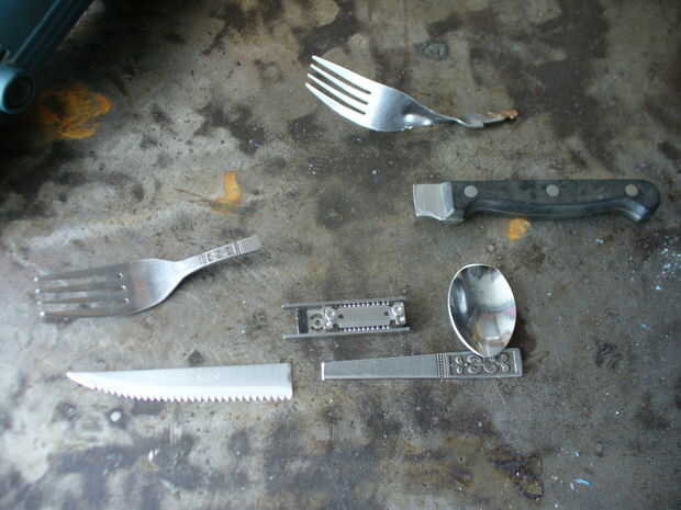 Dividir la otra horquilla 40mm desde la base y mango de descarte. Gire el trozo del mango 90 grados.
