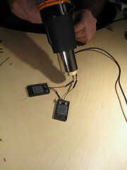 En su cable principal, deslice un trozo de calor pequeña tubería sobre el cable rojo del encogimiento. Todos los hilos sueltos del cable principal, así como los paneles solares con el palillo del flujo. Soldar cables rojo del cable principal y paneles solares entre sí. Repita con los cables negros. Deslice la tubería de encogimiento de calor sobre estos cables soldados y usar pistola de calor para encogimiento.