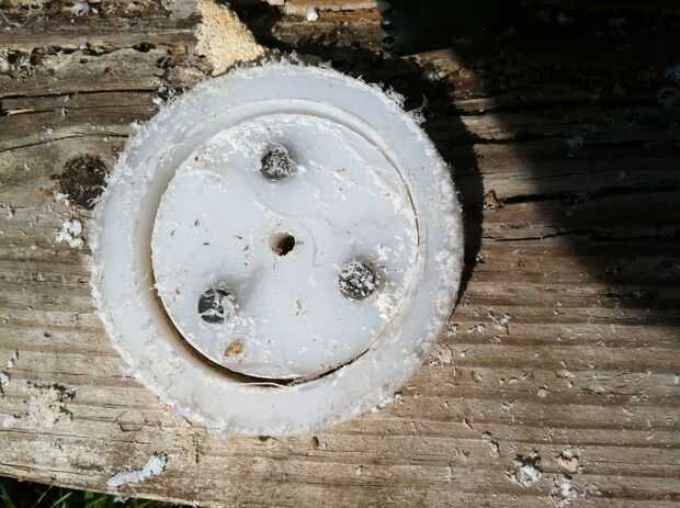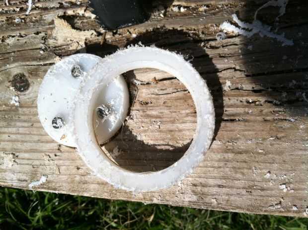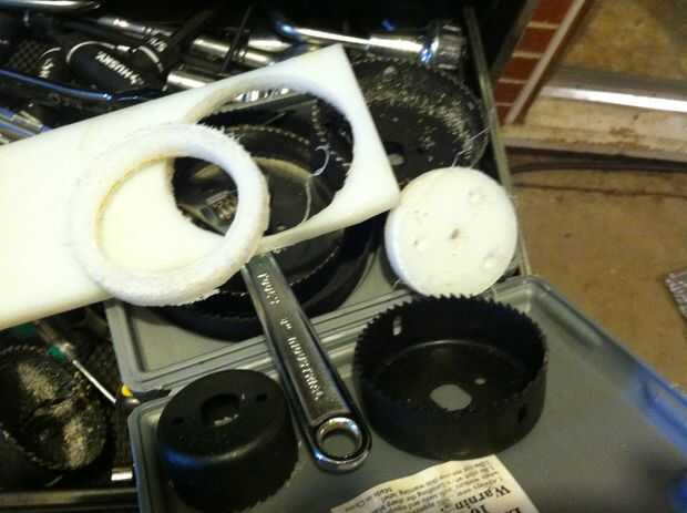 Ya que no tengo un agujero de 2-5/8-inch Sierra, utiliza una sierra del agujero de 2 1/2 pulgada para cortar el círculo y lo afeitó para 2-5/8 con un cuchillo retráctil caja. UHMW es bastante "suave" por lo que era fácil de hacer. Sólo ser paciente y verifique el ajuste tan a menudo como no afeitado apagado demasiado. Las sierras baratos también tienen un montón de 'bamboleo' por lo que es no un agujero de 2 1/2 pulgadas, de todos modos.