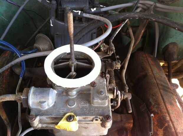 No he podido encontrar un canalización vertical/separador para un carburador de 2-5/8 cuello o un conveniente temprano de 2 barriles con aire HEI limpiador (conveniente en este caso también significa barato o gratis), por lo que encontré (por fin) la pieza de plástico UHMW de 1/2 de espesor que había 'almacenado en un lugar seguro' y mi propia canalización vertical/espaciador.