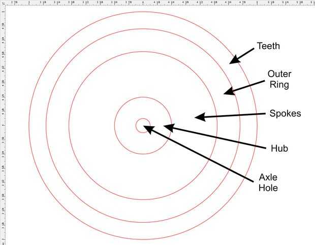 Cada equipo tendrá cinco regiones distintas como se muestra en la imagen.  Dibuja cinco círculos concéntricos de tamaño a su sentido de la estética.  En mi caso elegí diámetros de 0.125", 0.5", de 1,3", 1,7" y 2.0".  Esto resultará en un engranaje que es 2" de diámetro que se ajuste a un eje de 1/8".  No corte o grabado este patrón directamente, sino que se utilizará como base para el diseño de la forma de engranaje y el perfil.  Guardar este diseño, como la utilizas copias frescas en varios de los próximos pasos.