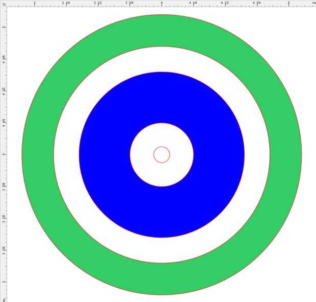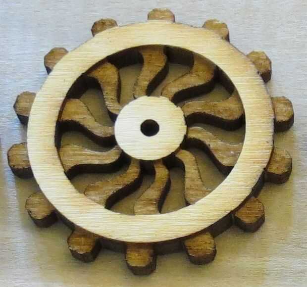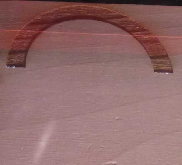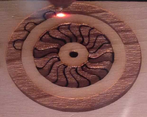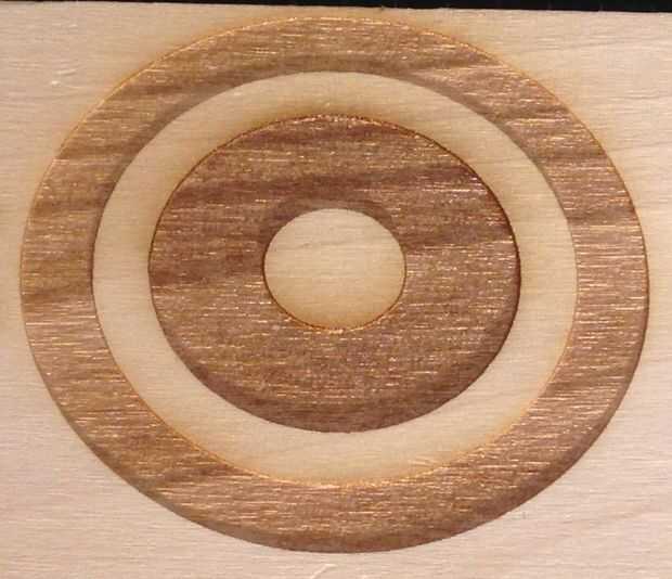 Ahora sigue un proceso de tres partes. Primero configura la configuración de láser para el color verde (100% de potencia, 50% de velocidad), desactiva todos los demás colores y había grabado ese anillo. Usted puede hacer varias pasadas hasta conseguir la profundidad deseada. Luego configura el color azul para la misma potencia y velocidad, desactiva el verde y había grabado el anillo interior. Una vez más, repetir hasta conseguir la profundidad deseada. Finalmente, cargar y cortar el contorno del equipo justo en la parte superior de la zona ahora grabada del álamo. Tienes tu primer material grabado plano!