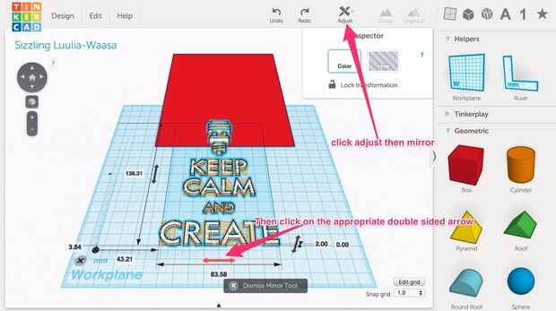 - El modelo del espejo si tiene texto. Primero seleccione el modelo (un contorno azul indica que un modelo en particular es seleccionado), haga clic en ajustedel espejoy haga clic en la flecha doble cara en la parte inferior. Despedir a herramienta de espejo.