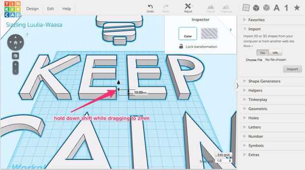 - Si has seguido todo lo que he hecho hasta ahora entonces el diseño es demasiado grande. Coloca el ratón sobre el botón de altura blanco. El botón blanco debe girar a rojo e indican que la altura es 10 m. Mientras mantiene pulsada la tecla shift, hacer clic y arrastrar el botón rojo de altura hasta que de a 2 mm. manteniendo pulsada la tecla Mayús mientras escala asegura que el modelo escala uniformemente.