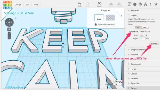 - Encontrar la ficha de importación Seleccione el. SVG generado, haga clic en importar. Si su diseño no aparece en el plano de trabajo o si el diseño 3D no coincide con su diseño del vector salida Troubleshooting.