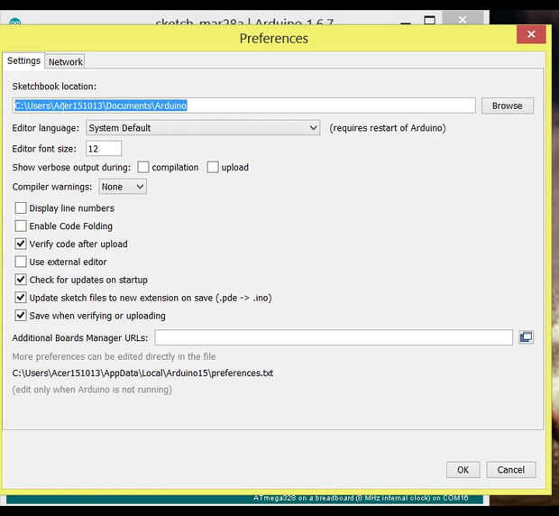 A continuación tenemos que buscar la carpeta de sketchbook de Arduino haciendo clic en archivo → preferencias → "Sketchbook Location". En mi caso "C:\Users\tomtomheylen\Documents\Arduino" Esto puede ser diferente en su caso.