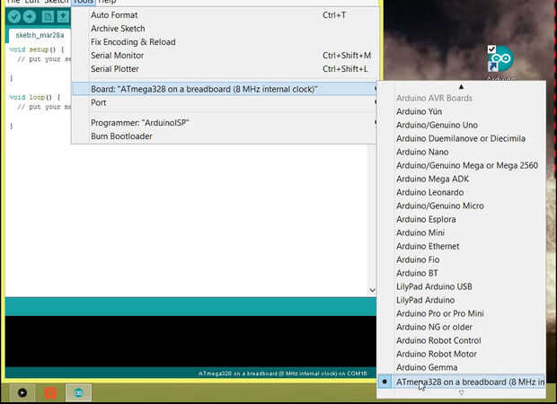 Si todo está bien, veremos en la lista "Atmega 328 en un protoboard (reloj interno de 8MHz)".