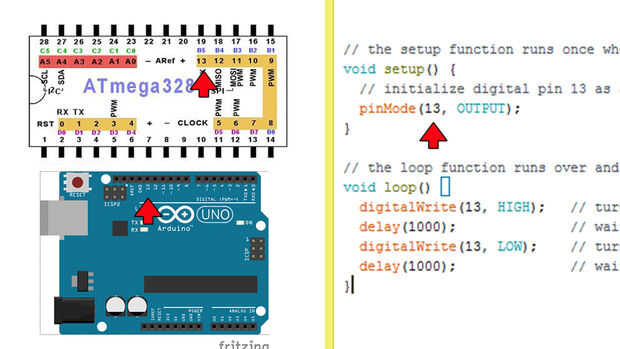 Por ejemplo si inicializa pin 13 en el IDE, representa 13 pines en la placa Arduino o pin 19 en el ATMEGA328 la viruta.