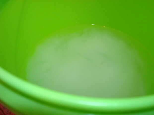 • Verter 2 1/2 galones de agua caliente en el balde, reservando 1/2 galón para calentar en la estufa.