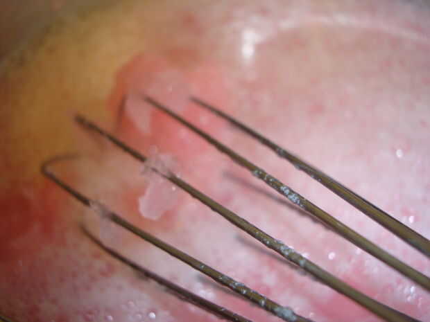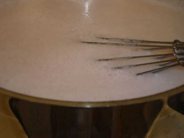 • Lentamente verter y remover con el batidor (o espumadera) el jabón rallado hasta que se disuelva completamente.