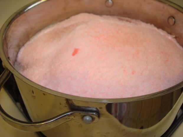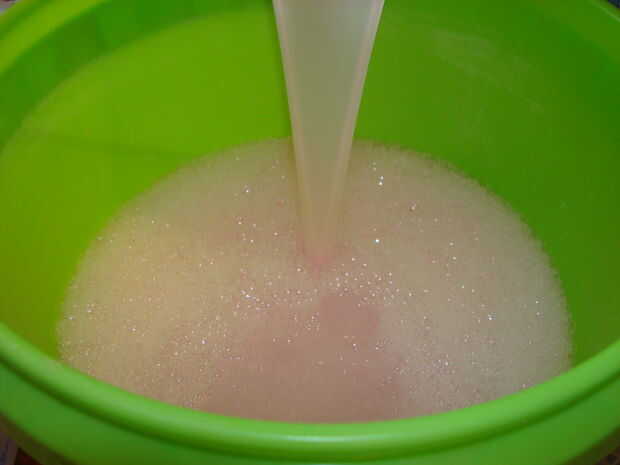 • Después de que el jabón Zote ha disuelto totalmente verter el contenido en el recipiente de mezcla de agua/soda y revuelva.