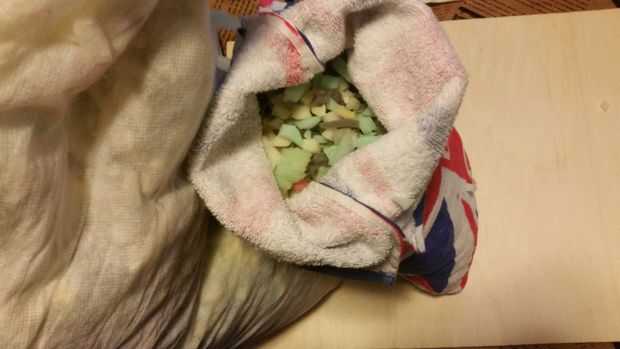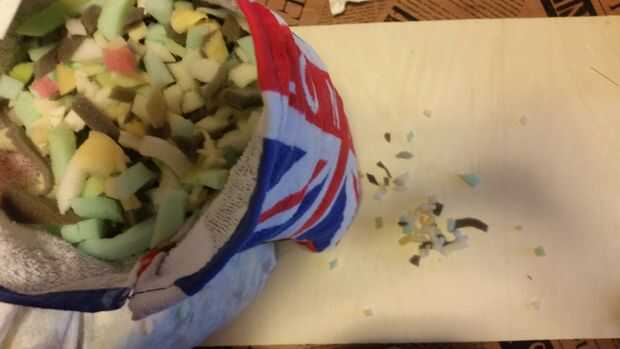 Ahora llene la bolsa acaba de crear con la espuma (yo usé una almohada vieja).