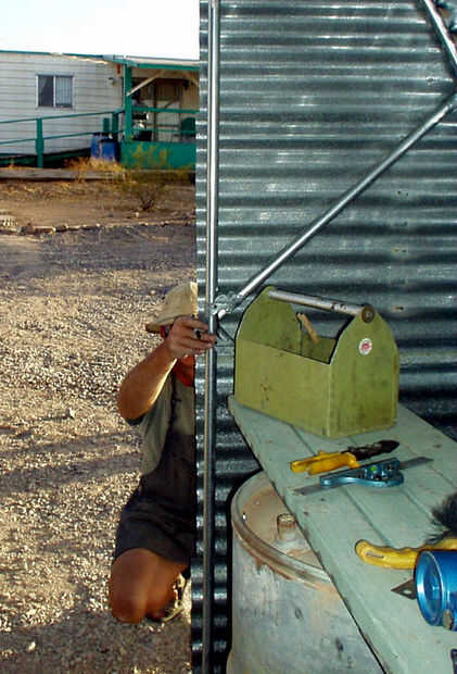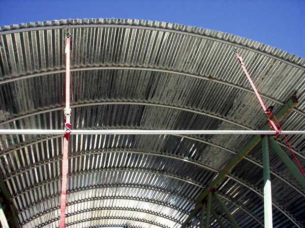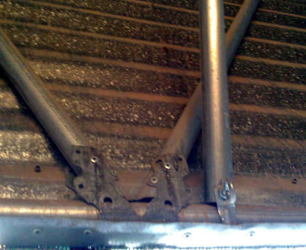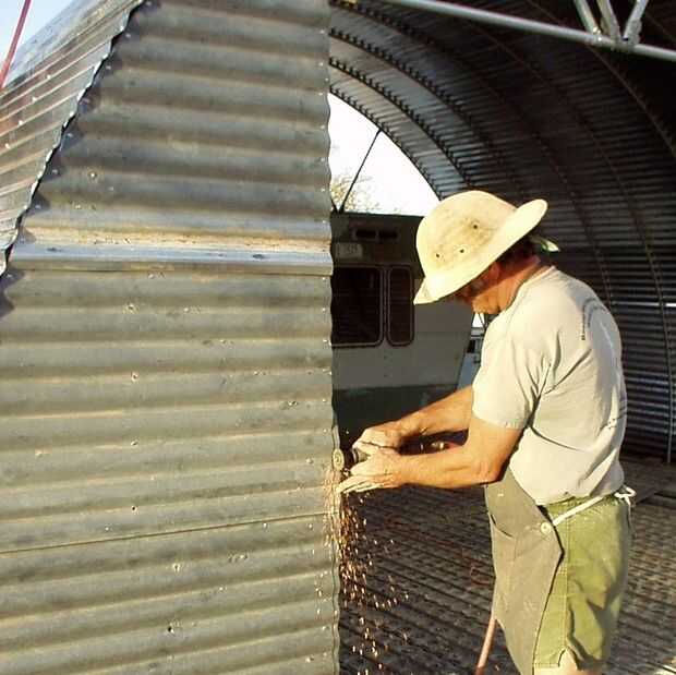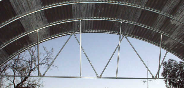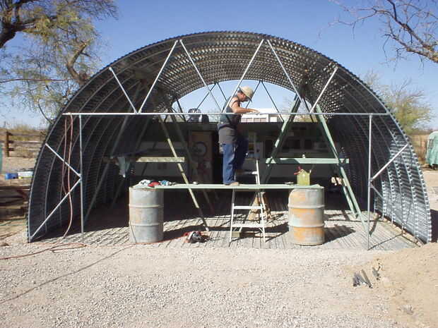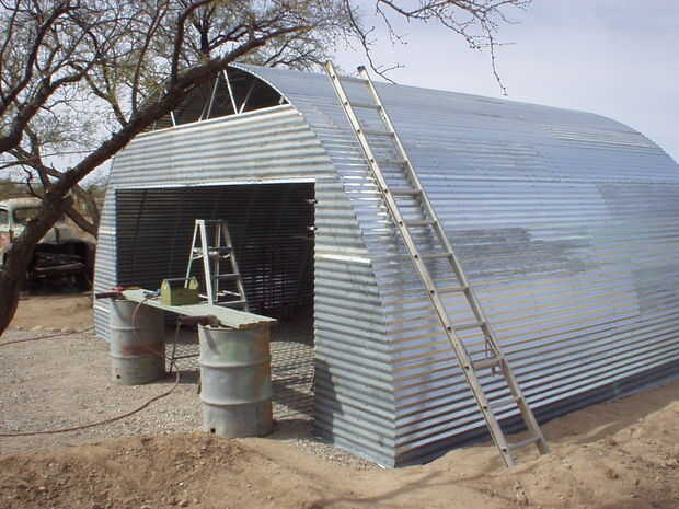 Las aberturas se enmarcan con más 1" conducto, clavado junto con los soportes que luego fueron clavados a la estructura. Los soportes se adaptan de conectores de la estructura (generalmente utilizados para unir 2X4s). La cara de la estructura se enmarca y cuatro diagonales correr dentro del edificio a la segunda costilla de cada extremo para la fuerza adicional. El acero corrugado sobra desde el desmontaje de la vieja ramada se acostumbra a la piel el extremo de la puerta. Se clava en la misma manera que se instaló el resto de la piel.