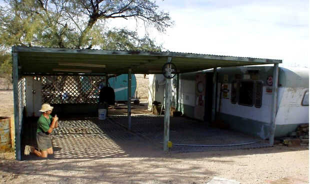 Mi esposo fue un "árbol de la sombra" mecánico, en el sentido de que muchos de sus primeros proyectos se realizaron literalmente debajo de un árbol. El tiempo viene cuando algo mejor es necesario. Este ramada fue la primera idea. Hizo un buen trabajo de guardar el sol fuera de nosotros, por un tiempo, pero estaba hecha de madera. A pesar de que los postes fueron tratados y fijar en concreto, eventualmente las termitas consiguieron para ellos. Luego una desagradable tormenta llegó, recogió todo sobre un pie y (Afortunadamente) ponerlo hacia abajo. Ahora ya no es estructuralmente. Este es un buen momento para construir algo mejor. Estábamos buscando algo cómodamente asequible (ya que el Banco no presta a nadie dinero a menos que demuestran que no necesitan!) y cero mantenimiento (ya que tenemos cosas más interesantes que hacer que las reparaciones del hogar).