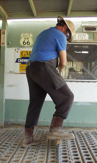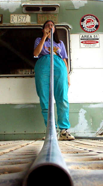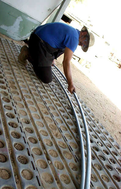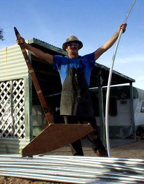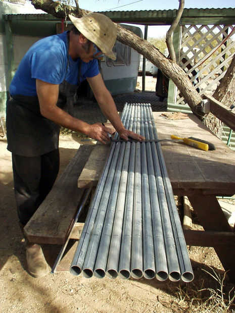 Ya que este edificio es la mitad de un cilindro de diámetro de 20 pies, las costillas deben ser curvadas a un radio de 10 pies. Todos los conductos fueron marcados a intervalos de 6 pulgadas por lo que la curva puede ser controlada con precisión. La razón que hace la herramienta de plegado (en vez de comprar uno) es sólo esperábamos usarlo una vez, así que no justifica gastar dinero en uno, y, más importante aún, necesitamos uno que produce una curva de radio más grande. Nuestro se hace igual que los encontrarás en las tiendas, excepto la madera.