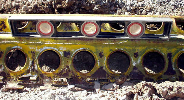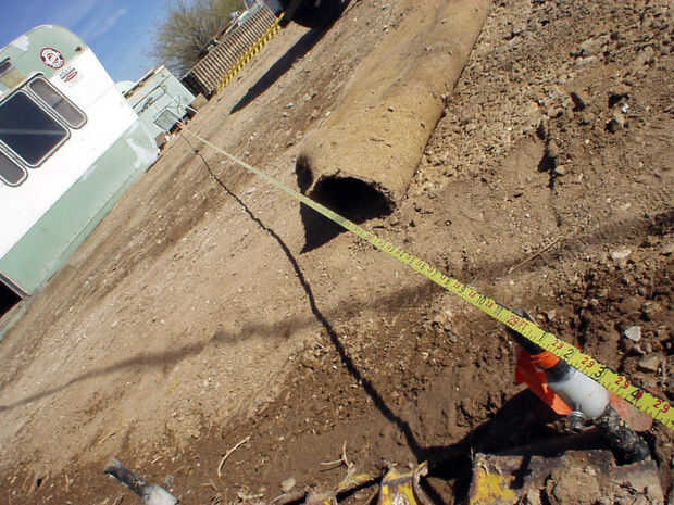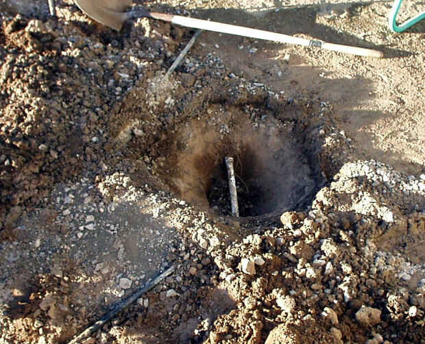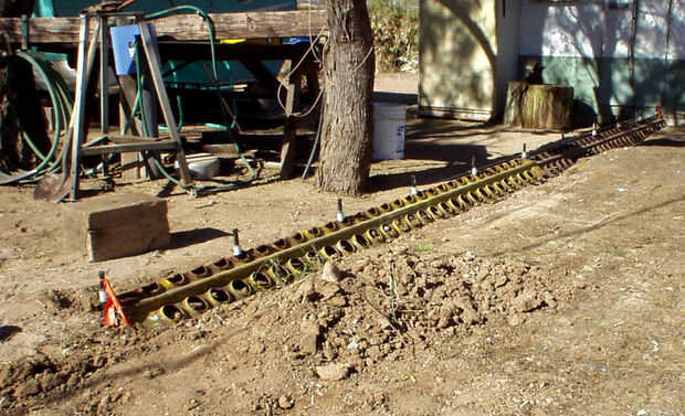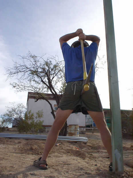 Las estacas preparadas desde el último paso fueron conducidas en los orificios de la PSP en intervalos de dos pies, momento en el que nos golpeó nuestro primer inconveniente importante... No hay ninguna sensación de bastante encontrar por ahí es una tubería de agua que no sabías sobre... Detener el diluvio! Nos costó dos días de trabajo, porque un "ayudante" (que fue posteriormente despedido del proyecto!) desenterró la Fundación entera de ese lado en un esfuerzo para "solucionar" el problema... y no arreglarlo.