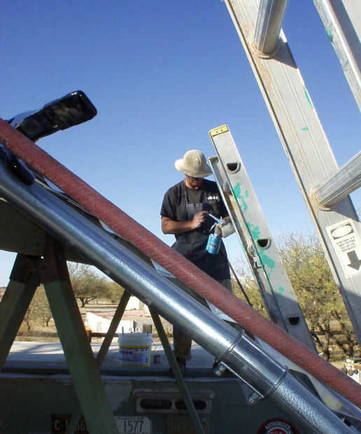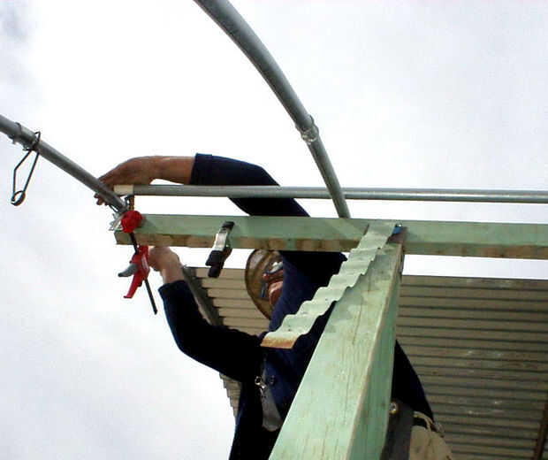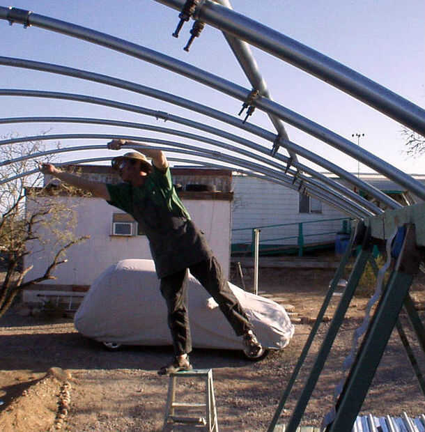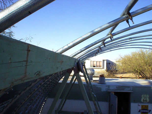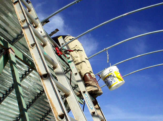 Movimiento sobre la parte superior, este proyecto comenzó a llegar un poco dicey. Pega #3 fue una escasez de escalera: el edificio es de 10 pies de altura, y la escalera más larga que tenemos es de 11 pies. No digas al tipo de OSHA! De alguna manera hemos conseguido con andamios creativa. En la parte superior, las escaleras que se inclinó contra un mástil provisional, con sólo pulgadas de sobra. Porque el edificio todavía está en parte esquelético en esta etapa, las escaleras pueden colocarse en las costillas, hacer las cosas más seguras.