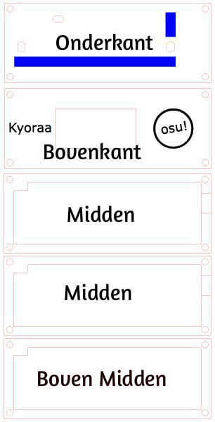 De carcasa bestaat uit 4 lagen triplex. De dikte van de triple es 3 mm. De bouten zijn 2mm dik en hebben een schroef diámetro van 3 mm. De schroeven voor de zijn caso 3mm dik en zijn 12mm lengua De schroeven voor de pseudo printplaat, controlador onderkant zijn caso 3mm dik en 9mm lang.