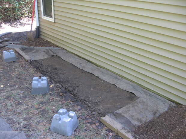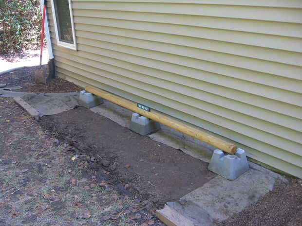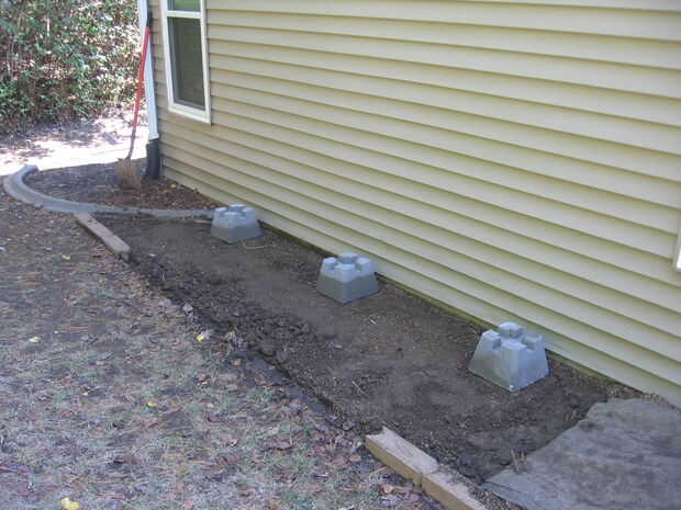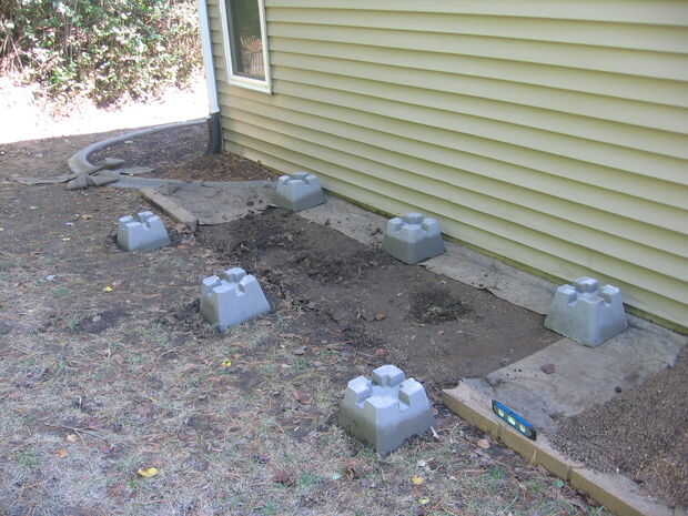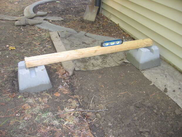 Una vez los tres traseros pies de página concreto, coloque los otros pies de página de árbol en su lugar y asegúrese de que estén a nivel. Tuve que sacar alguna suciedad para conseguir el ajuste. Un nivel será tu mejor amigo durante este paso. Cuanto más nivel mejor. Esto es todo lo que tenía. Si utilizas una madera paisajismo a nivel de que los pies de página Asegúrese de que es muy recta y plana.
