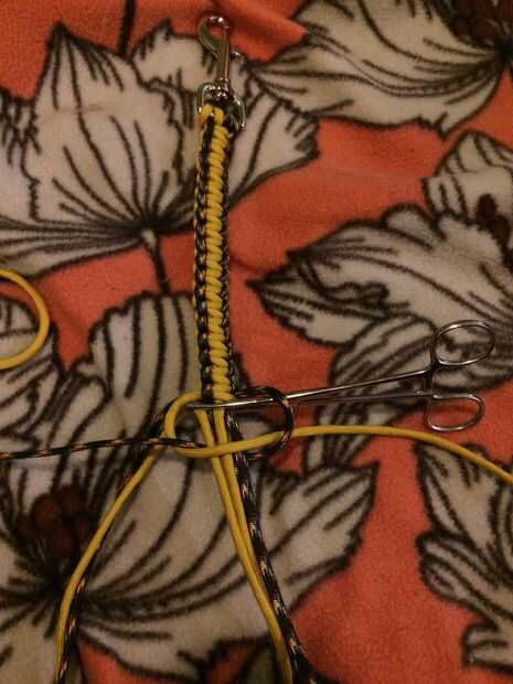 Una vez que han "garantizado" su lazo, comienza anudando en el lazo, como si fuera para el resto de la correa. Determinar cuánto de la manija que desea ser "conectados" que quería 4 pulgadas. Una vez que sólo tenía 4 pulgadas a la izquierda, se reúnen el lazo y las colas y nudo sobre ellos, que seguro que la colas son frente a la dirección correcta. Debe tener la cola paralela al mango y frente al gancho de seguridad.