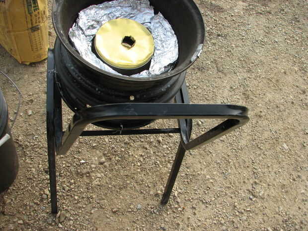 Conseguir la tapa de una lata de palomitas de maíz de Boy Scout y perforar un agujero del tamaño de la pipa de acero. Esto es sólo para llenar el agujero en la base de la llanta de neumático. Funciona realmente bien, pero cualquier finos trabajos de metal (otra vez, en base a disponibilidad).