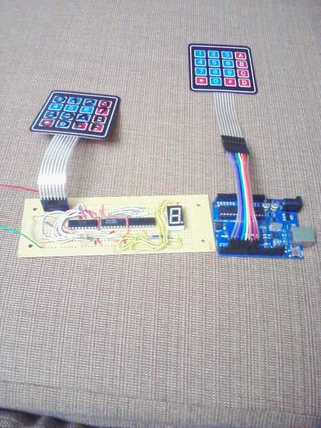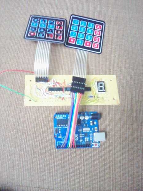 este proyecto en su primera parte consta de dos componentes: un Arduino Uno y un teclado de matriz de 4 x 4. Para que usted pueda utilizar un código de Arduino con serial monitor para supervisar las teclas empujado en su teclado y luego puede ver los símbolos en el monitor del PC. Mientras que sin utilizar código, puede utilizar el mismo 4 x 4 matriz del teclado, un codificador de CI 74C922, un IC decodificador 7447, y un ánodo común pantalla de LED de 7 segmentos para mostrar el resultado presentado por la tecla presionada en el teclado. Tenga en cuenta que un IC74C922 requiere utilizar un teclado de matriz de configuración hexadecimal 4 x 4 (0, 1, 2, 3, 4, 5, 6, 7, 8, 9, A, B, C, D, E, F) ya que también exige que el carácter escrito en el teclado numérico es el mismo que estás viendo en la pantalla de su proyecto. Ahora, te invito a ver el siguiente video en: https://www.youtube.com/watch?v=e34_IaNiyEs